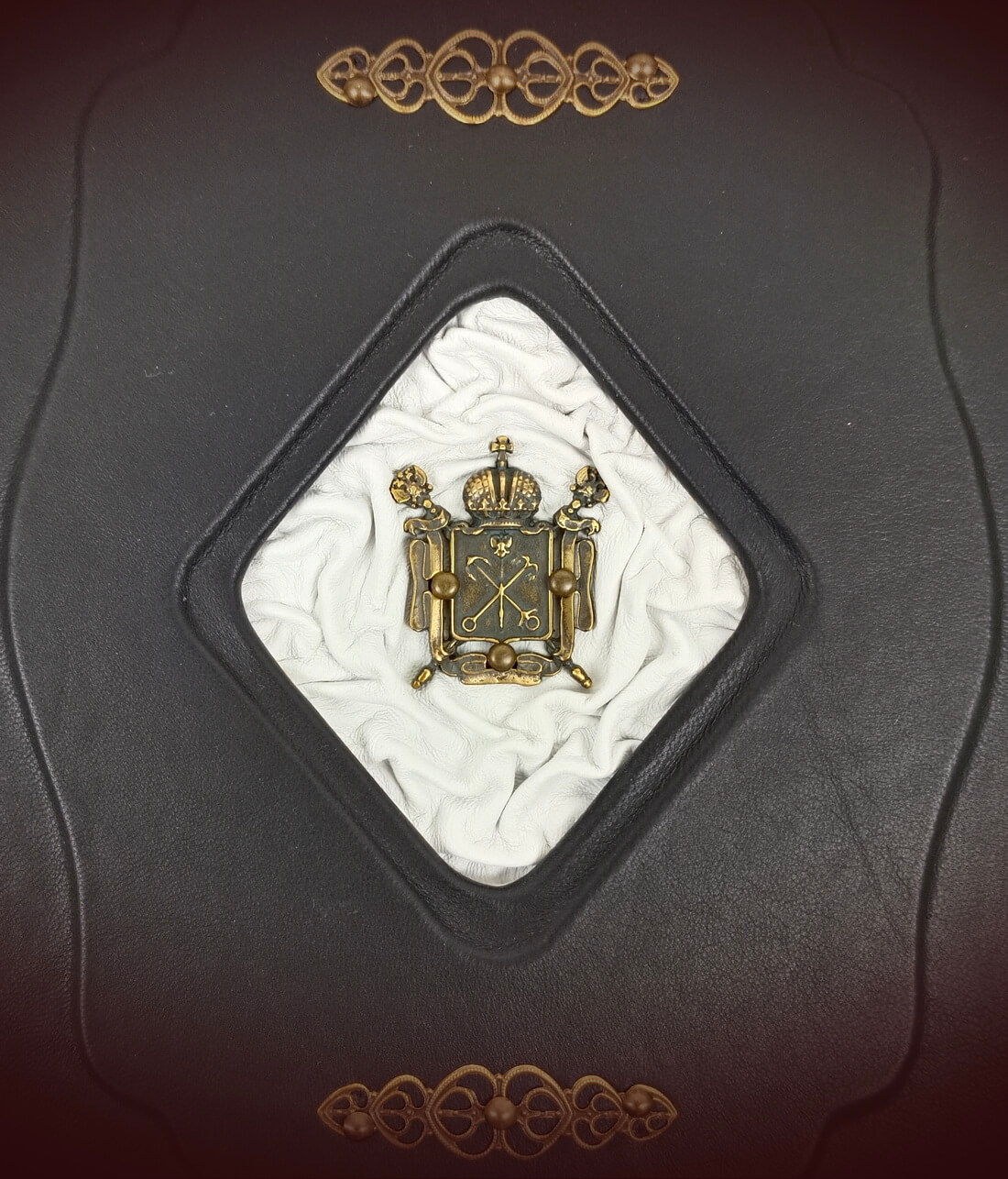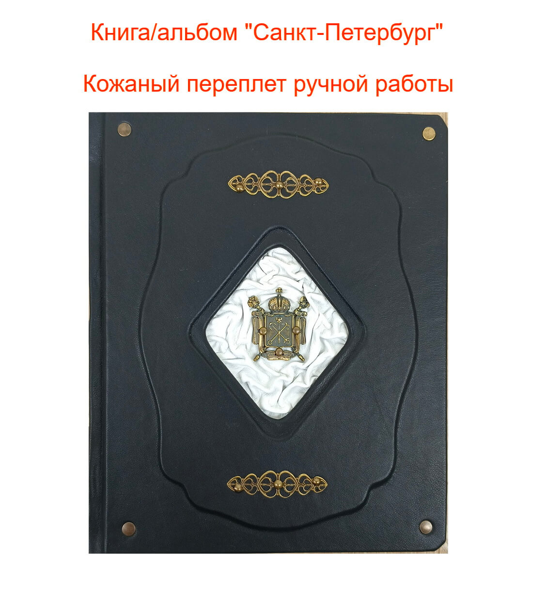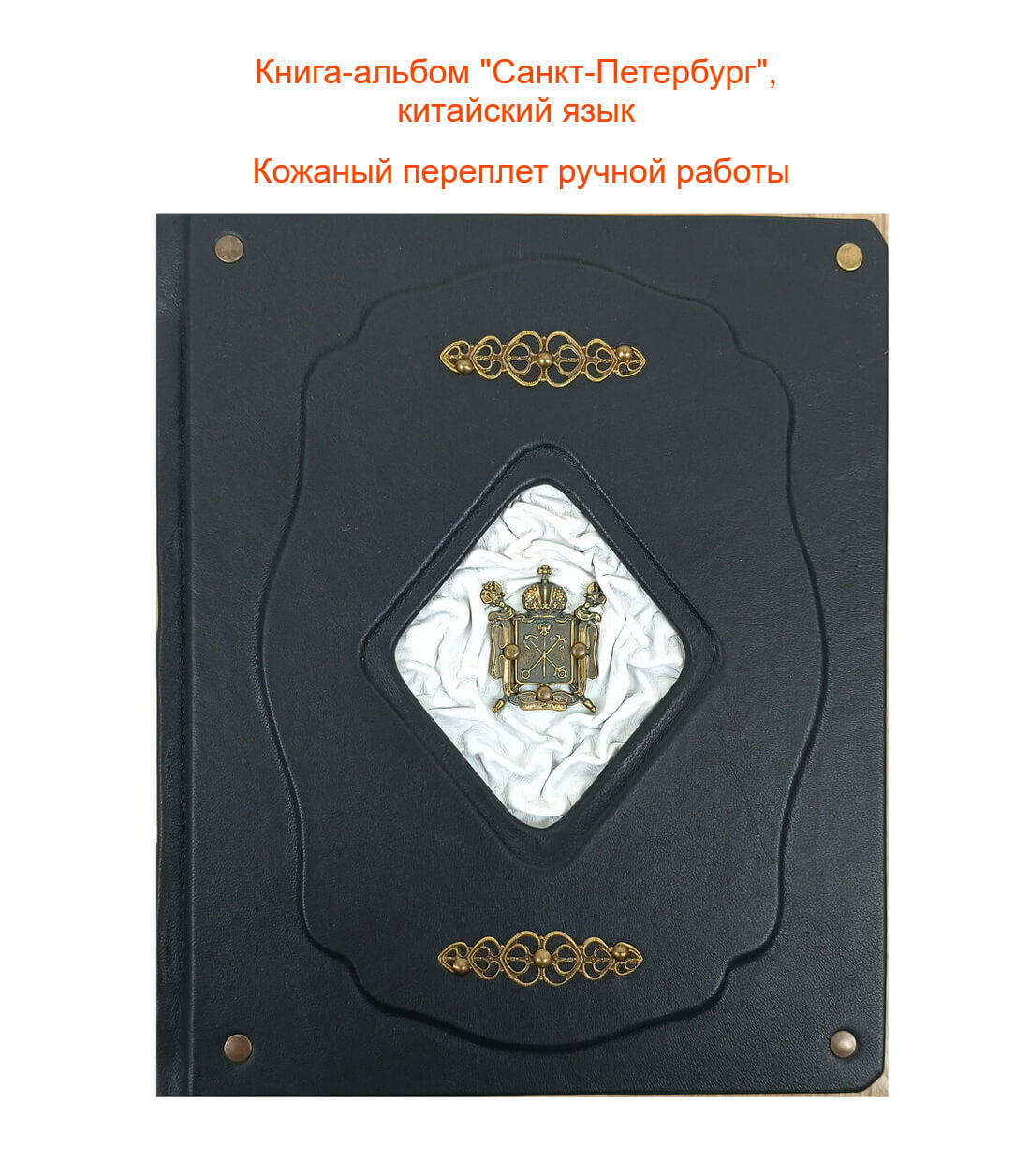 Подарочный иллюстрированный альбом-книга «Санкт-Петербург» на китайском языке c массой красочных фотографий Санкт-Петербурга, а также окрестностей: Петергофа, Царского Села, Павловска, Гатчины, Ораниенбаума. Для переплета этой книги использована кожа темно-синего цвета. В центре — вставка из натуральной кожи белого цвета на которой размещена декоративная металлическая накладка с гербом Санкт-Петербурга.