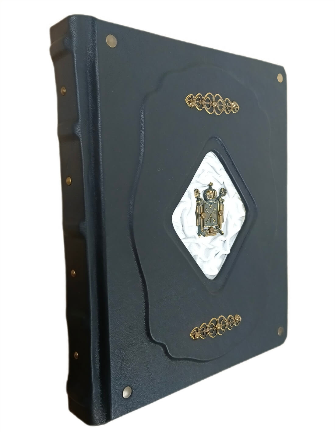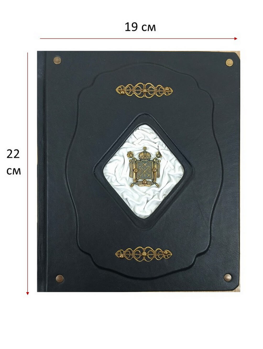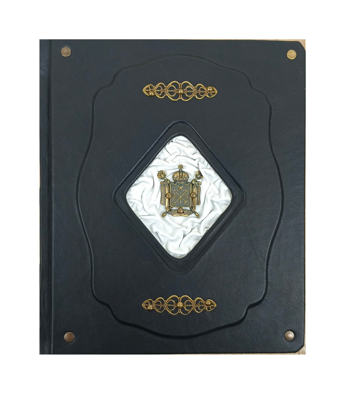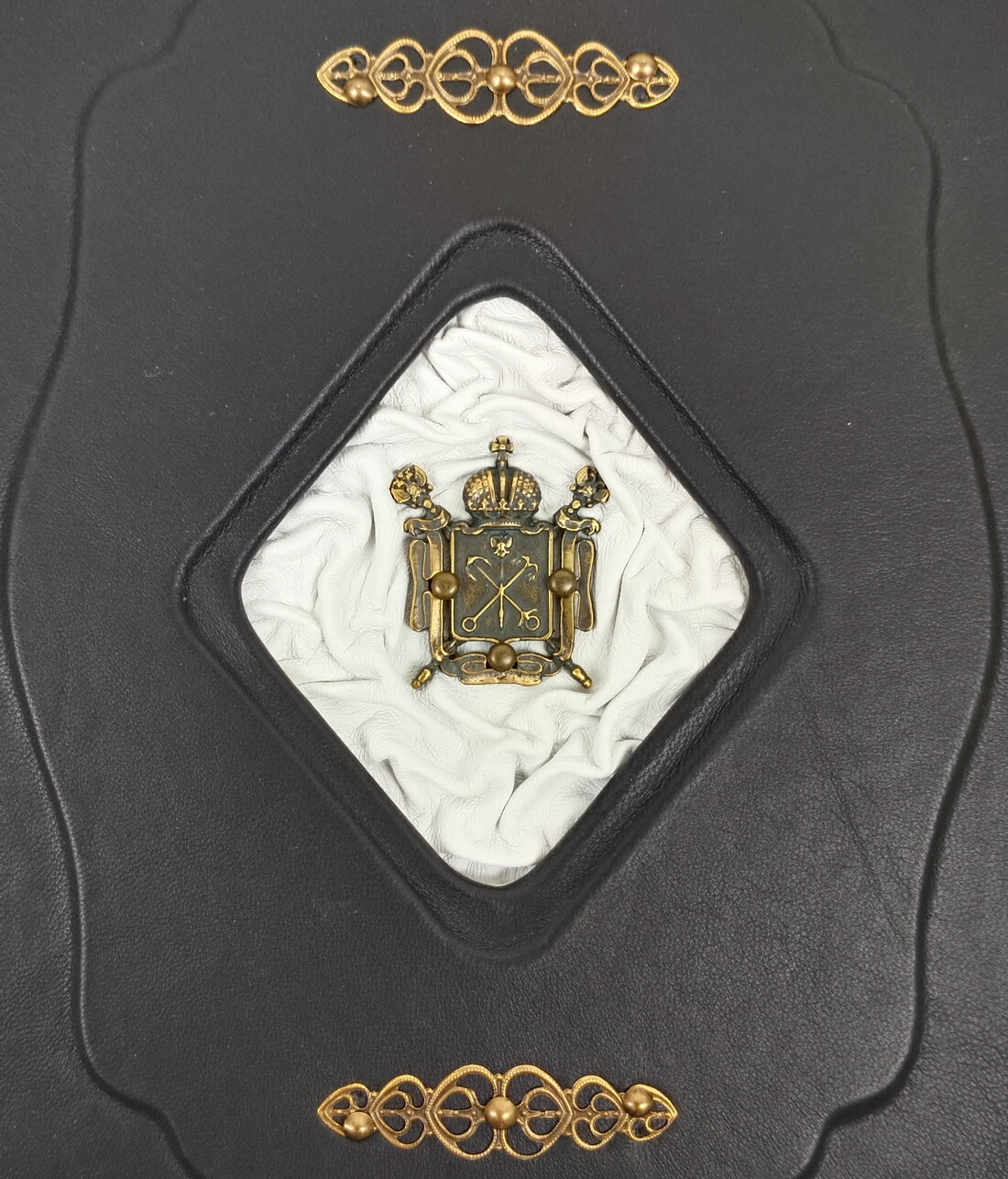 Подарочный иллюстрированный альбом-книга «Санкт-Петербург» на китайском языке c массой красочных фотографий Санкт-Петербурга, а также окрестностей: Петергофа, Царского Села, Павловска, Гатчины, Ораниенбаума. Для переплета этой книги использована кожа темно-синего цвета. В центре — вставка из натуральной кожи белого цвета на которой размещена декоративная металлическая накладка с гербом Санкт-Петербурга.