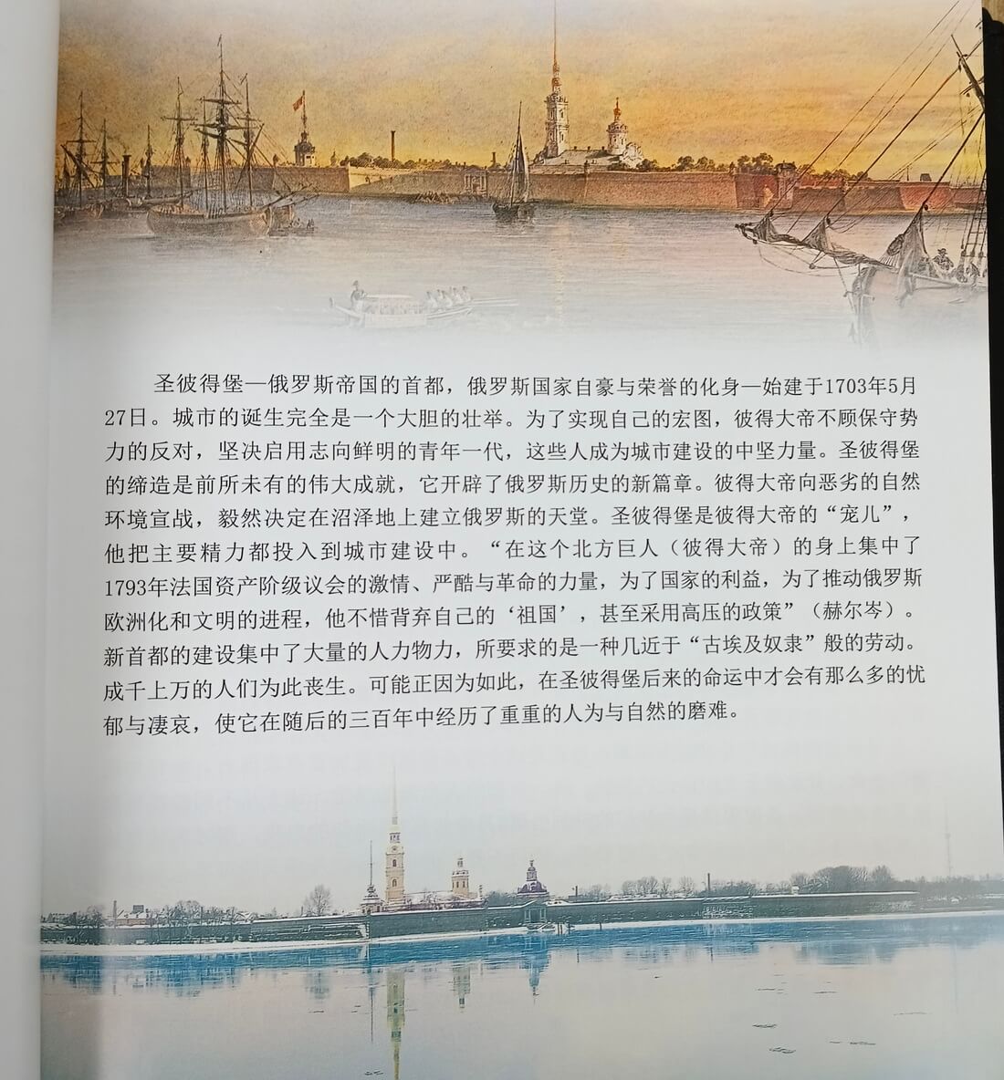В книге-альбоме о Санкт-Петербурге 304 страницы, ее приблизительный размер (с учетом кожаного переплета) 19х22 см. Фотографии снабжены описаниями и комментариями на китайском языке.