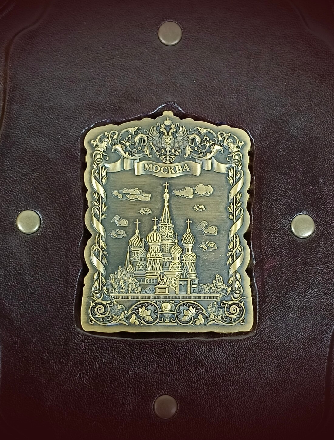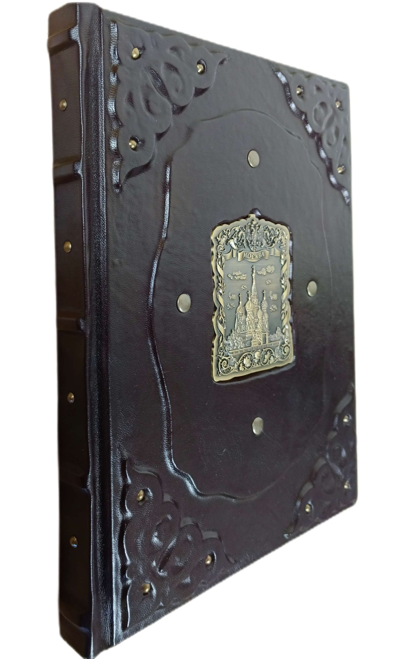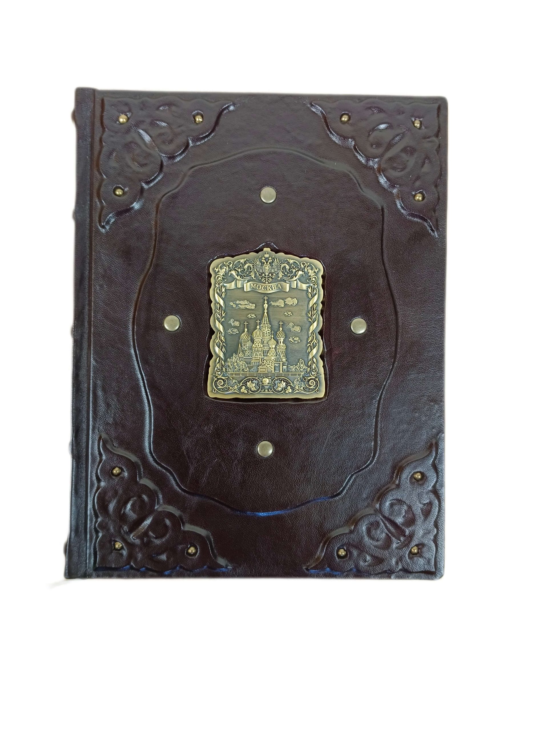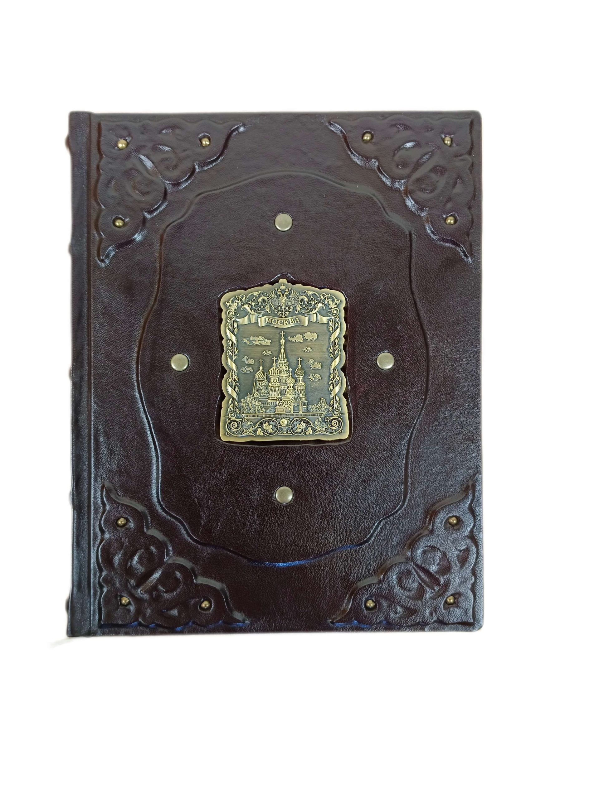 Книга «Мистическая Москва. Самые загадочные места и легенды» в кожаном переплете от мастерской LIKOR. Для переплета этой подарочной книги о столице использована специально обработанная натуральная кожа темно-сиреневого (баклажанного) цвета. Кожа с легким блеском. На передней обложке созданы объемные эффекты, что подчеркивает ручную работу. В центре передней сторонки — декоративная металлическая накладка «Москва».