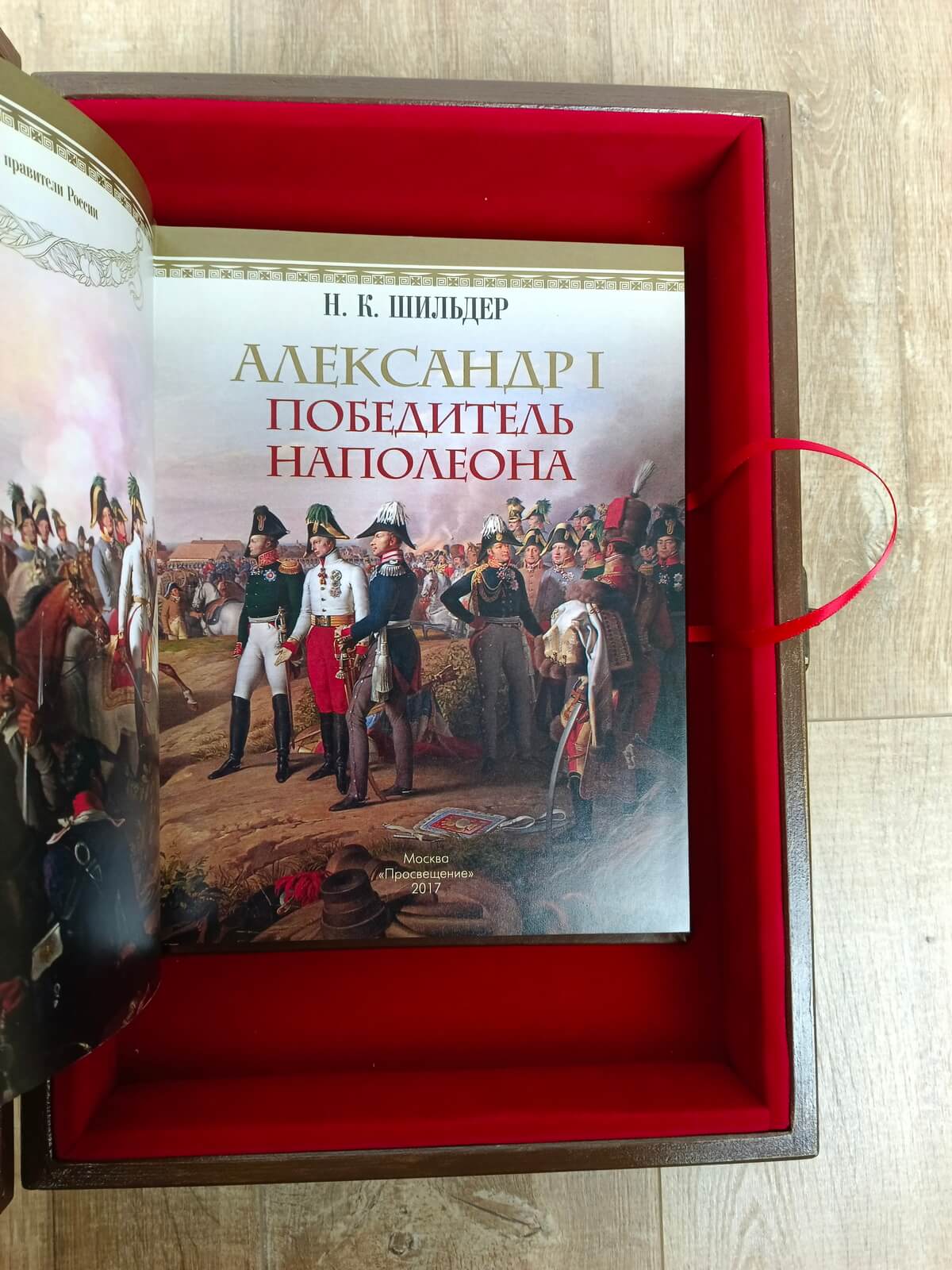 Подарочная книга про императора Александра в кожаном переплете и в подарочном коробе ручной работы — отличный подарок всем любителям истории, а также всем Александрам!
