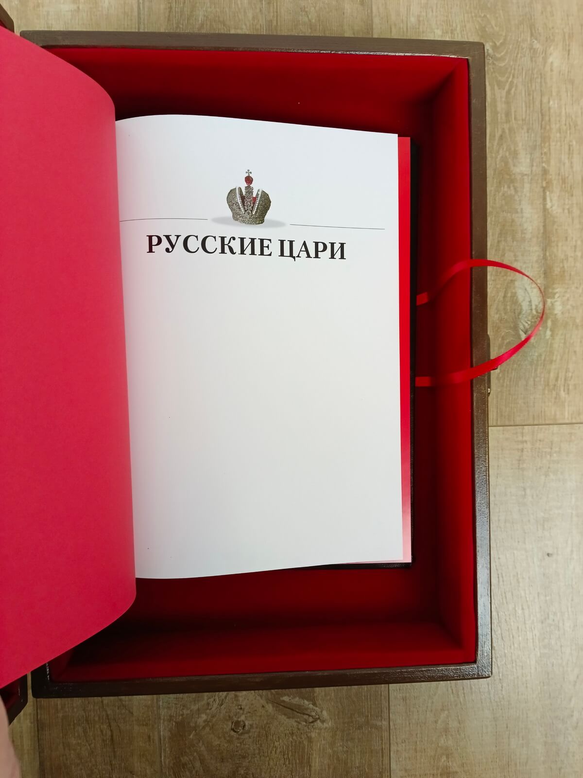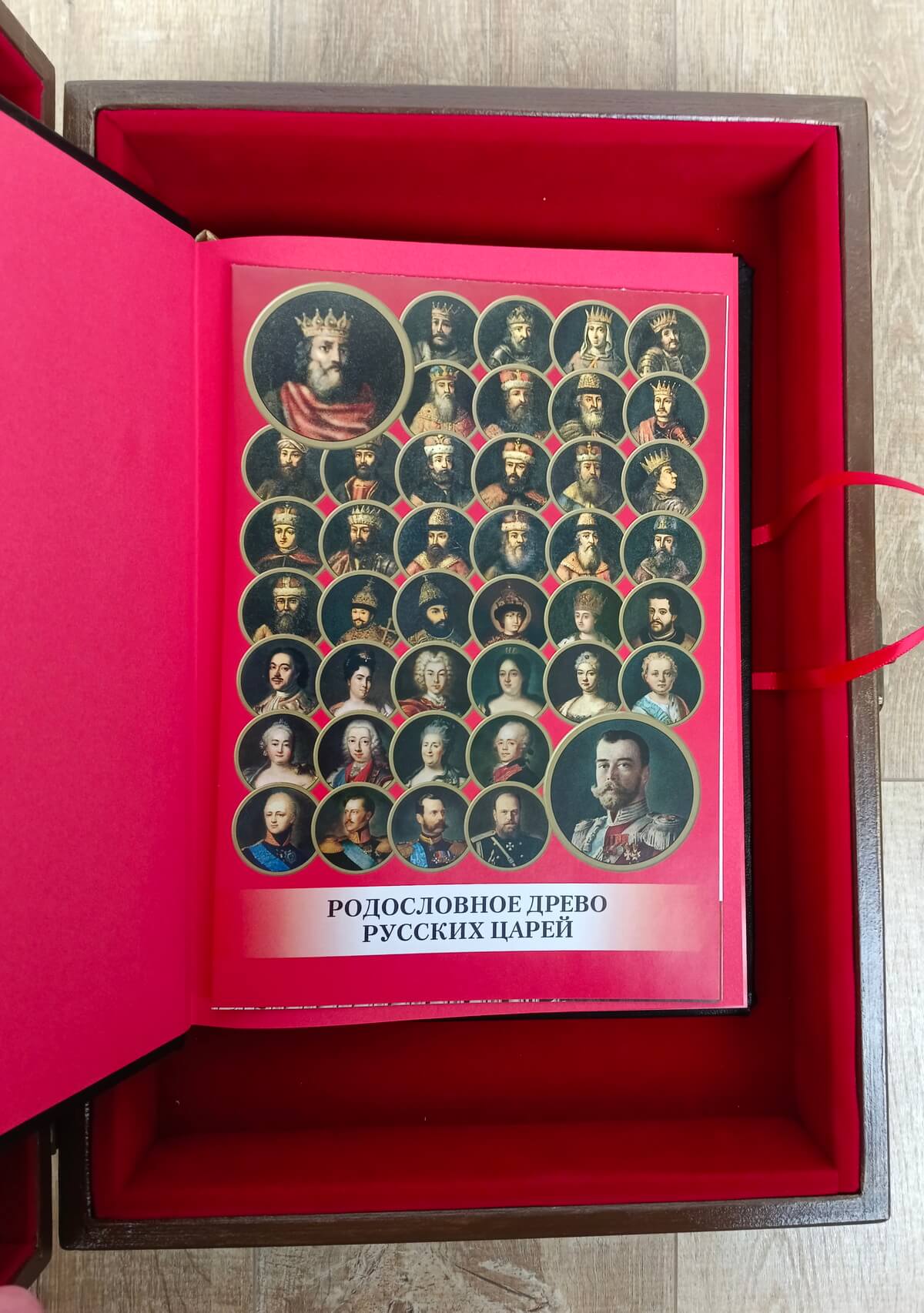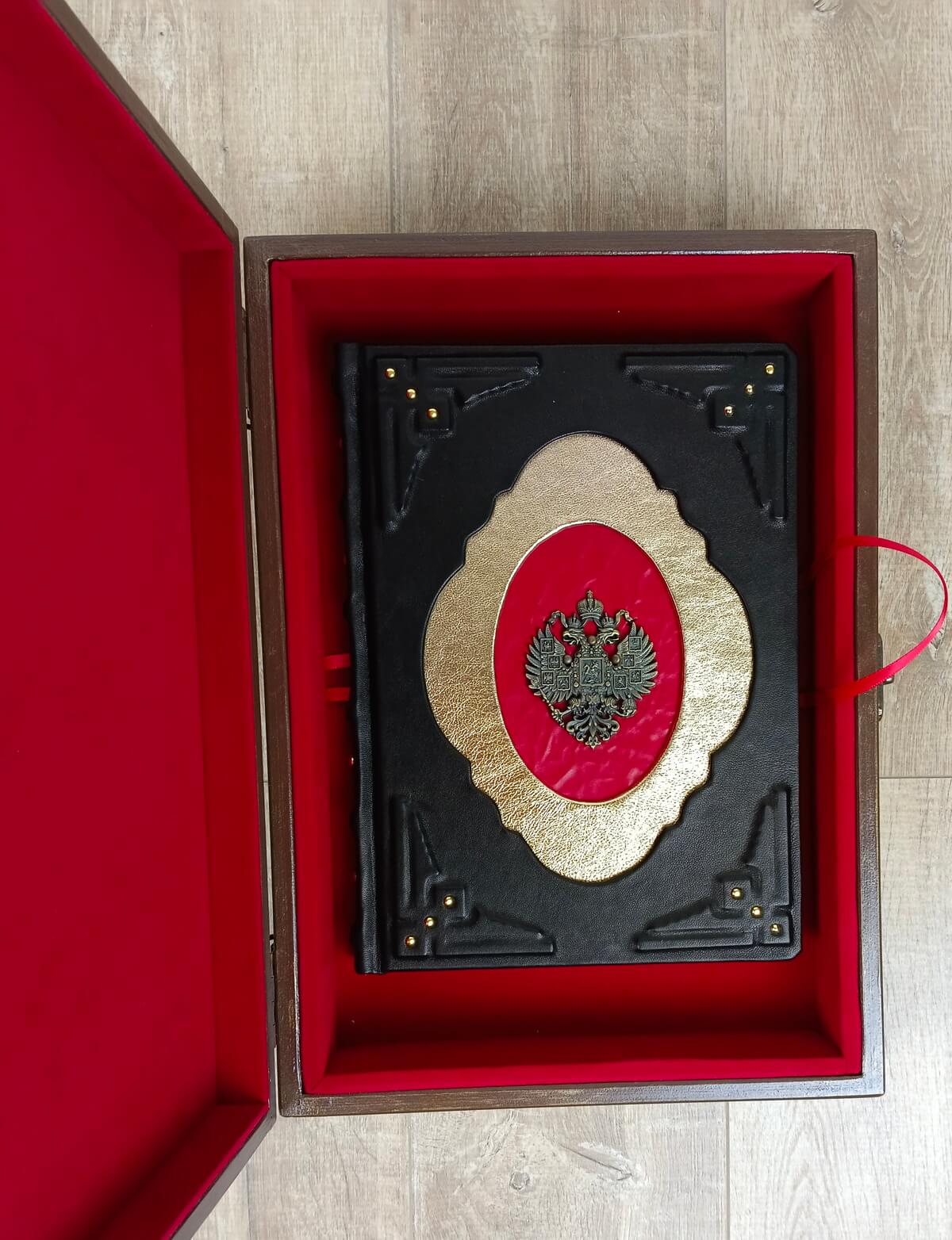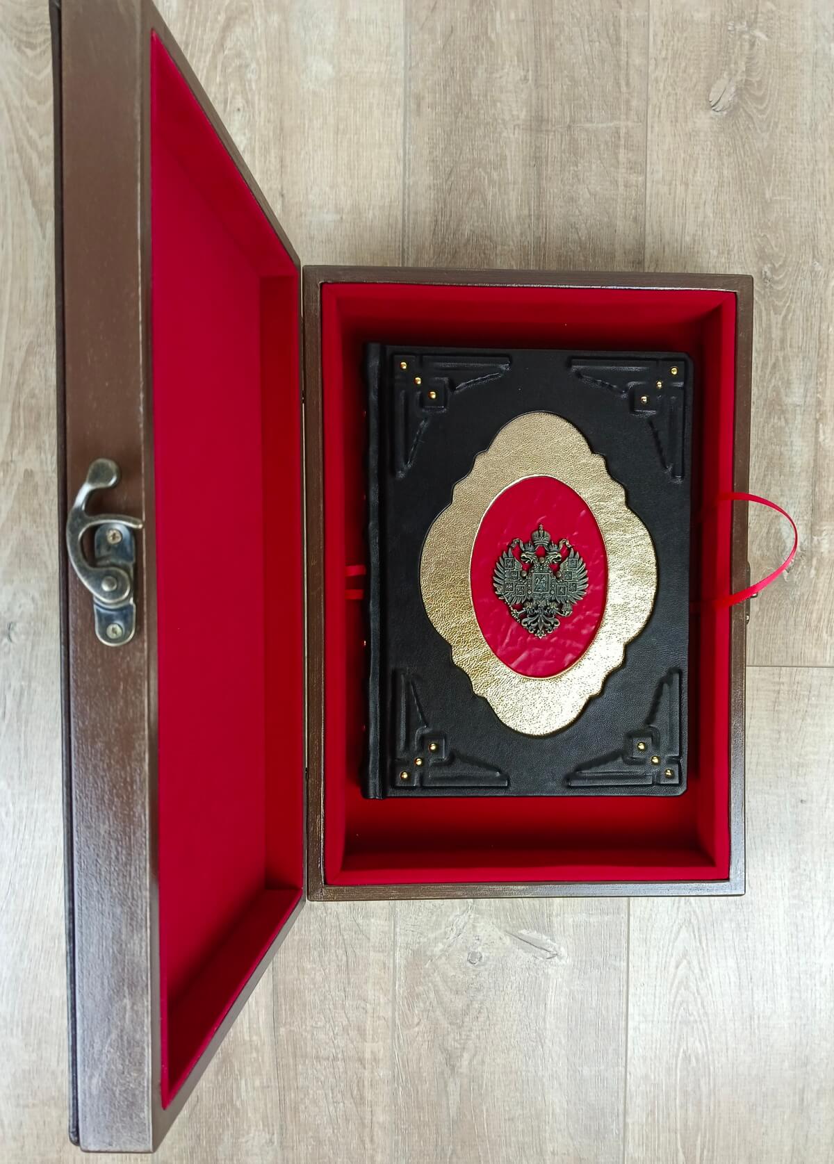 Книга «Русские цари. Рюриковичи. Романовы» в кожаном переплете от мастерской LIKOR в эксклюзивном подарочной упаковке — ларце-шкатулке.