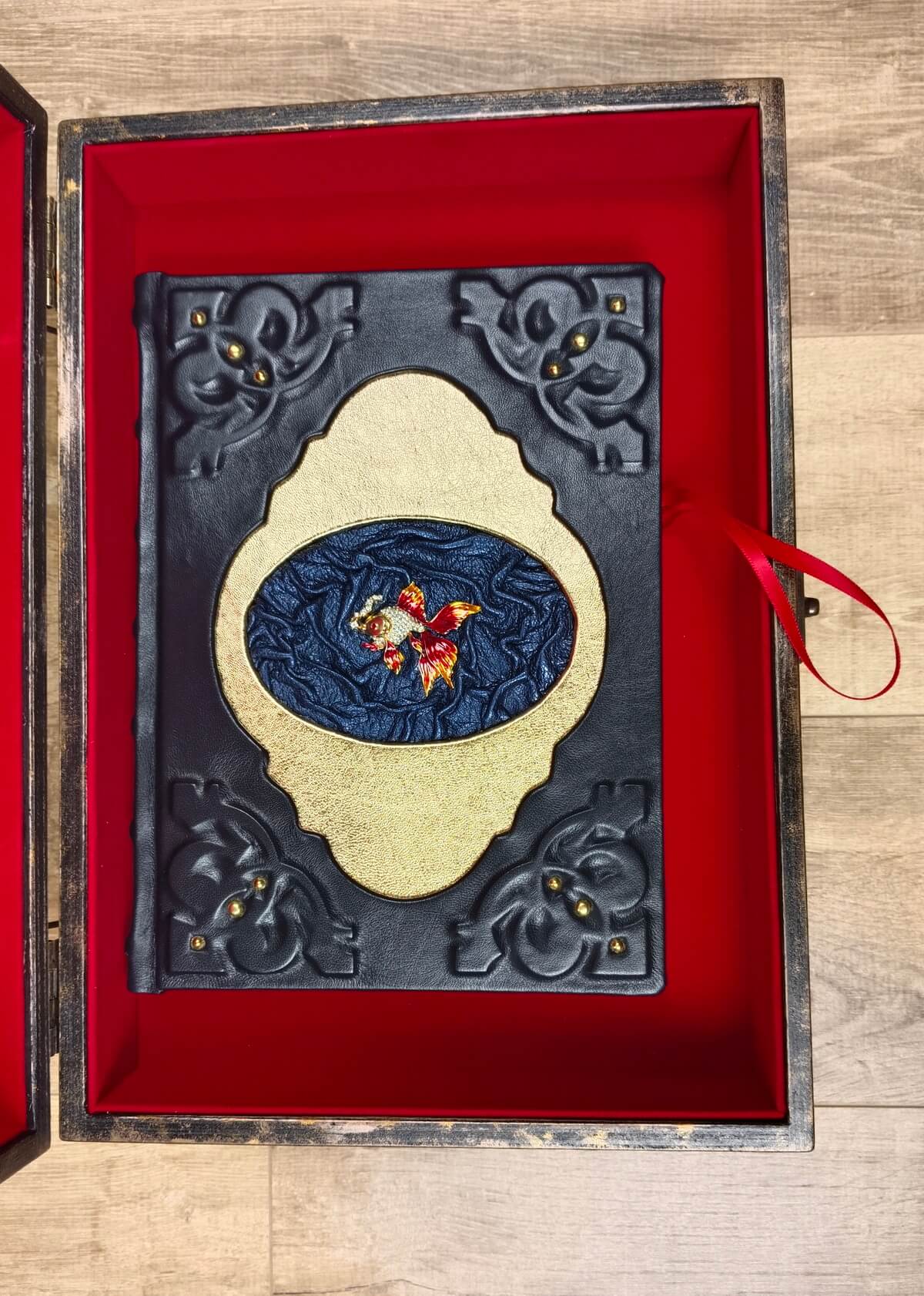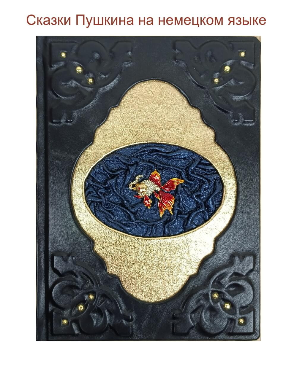 Для переплета использована темно-синяя натуральная кожа, в центре – декоративная накладка в виде Золотой рыбки на фрагменте натуральной кожи. Отличный подарок для детей и взрослых.