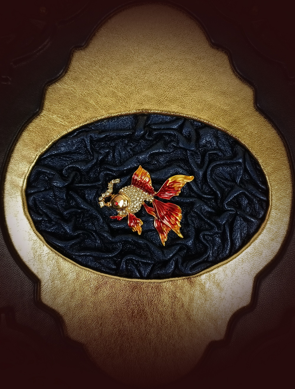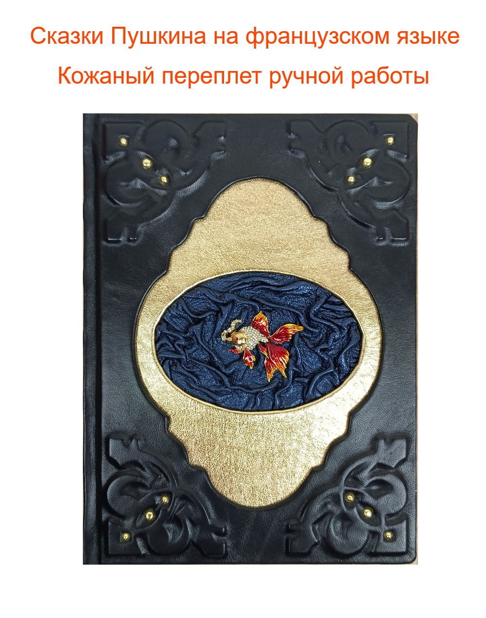 Для переплета использована темно-синяя натуральная кожа, в центре – декоративная накладка в виде Золотой рыбки на фрагменте натуральной кожи. Отличный подарок как для детей, так и взрослых.